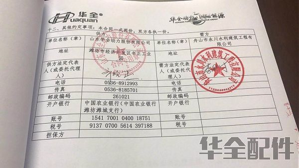 華全動(dòng)力(股權(quán)代碼171006)與舟山市永川水利建筑工程有限公司簽訂合同,為其供應(yīng)3臺(tái)大型發(fā)電機(jī)組-玉柴系列,分別為 2臺(tái)玉柴1000kw發(fā)電機(jī)